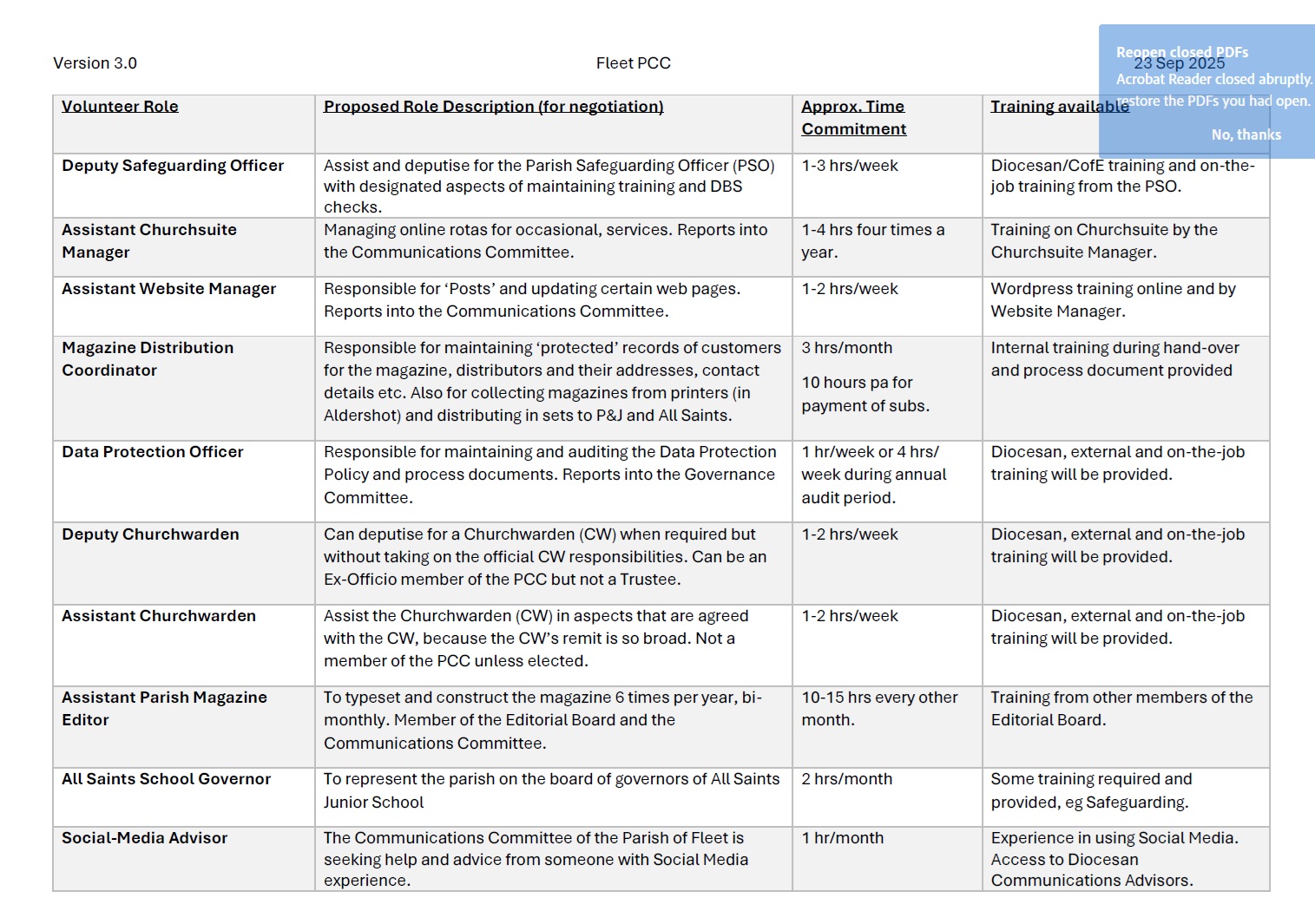 We are looking for volunteers for the following roles but the role description is for discussion and we hope to tailor each role to the volunteer’s skills and preferences. If you think you can help us in one of these voluntary roles, please contact a member of the clergy, the Churchwardens or the parish office – see Contact Us page.